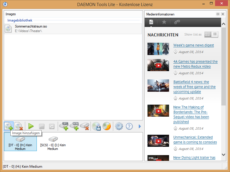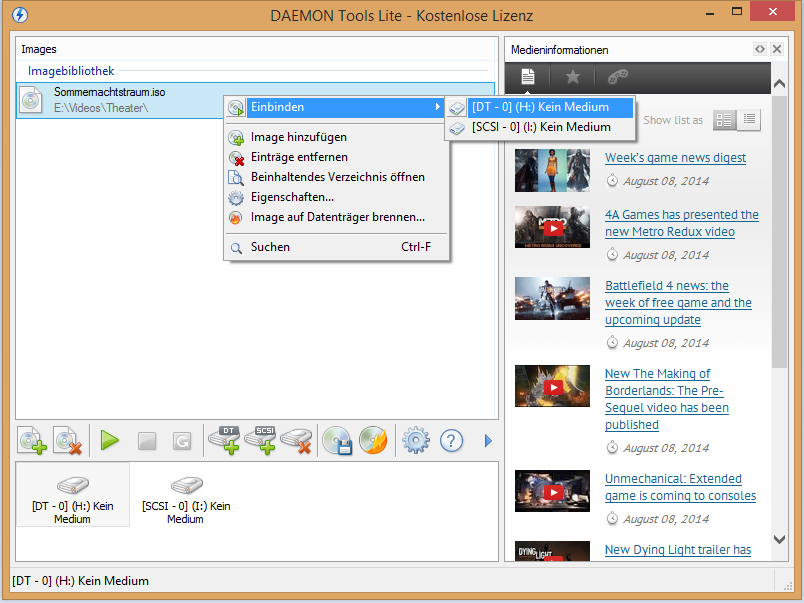 Dazu macht ihr einen Rechtsklick auf das Image und wählt: Einbinden ⇒ [DT – 0] (H:) Kein Medium